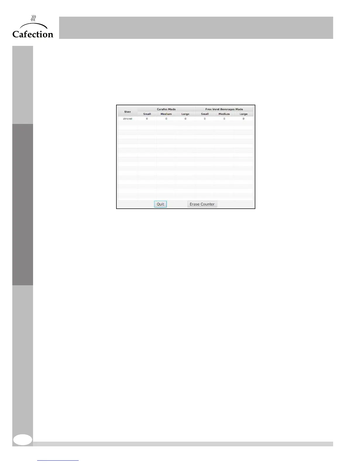 This counter records the quantity of carafes and free vends ordered by each user authorized