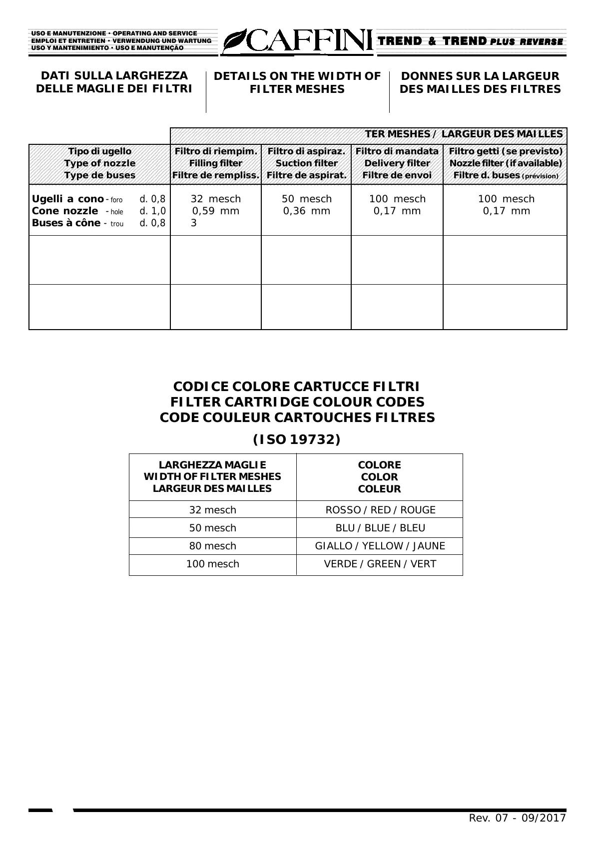 LARGHEZZA MAGLIE / WIDTH OF FILTER MESHES / LARGEUR DES MAILLES