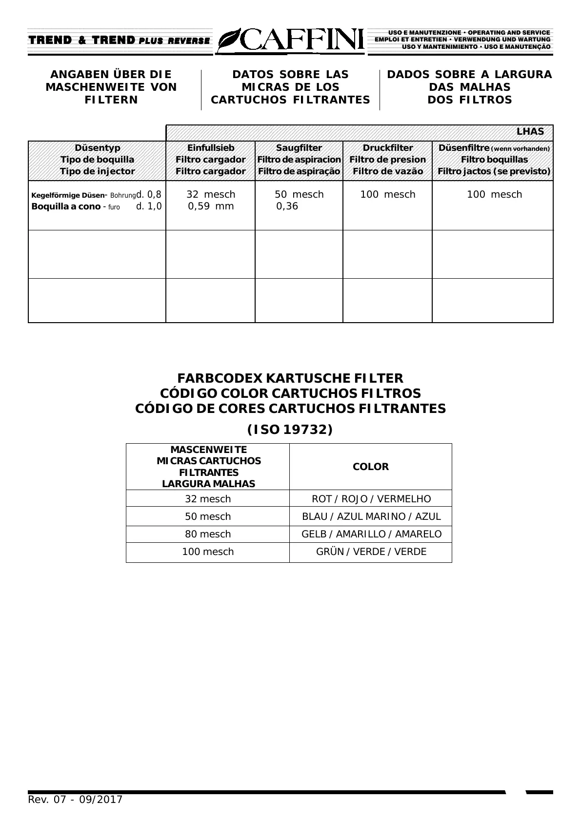 Tipo de boquilla Filtro cargador Filtro de aspiracion Filtro de presion Filtro boquillas