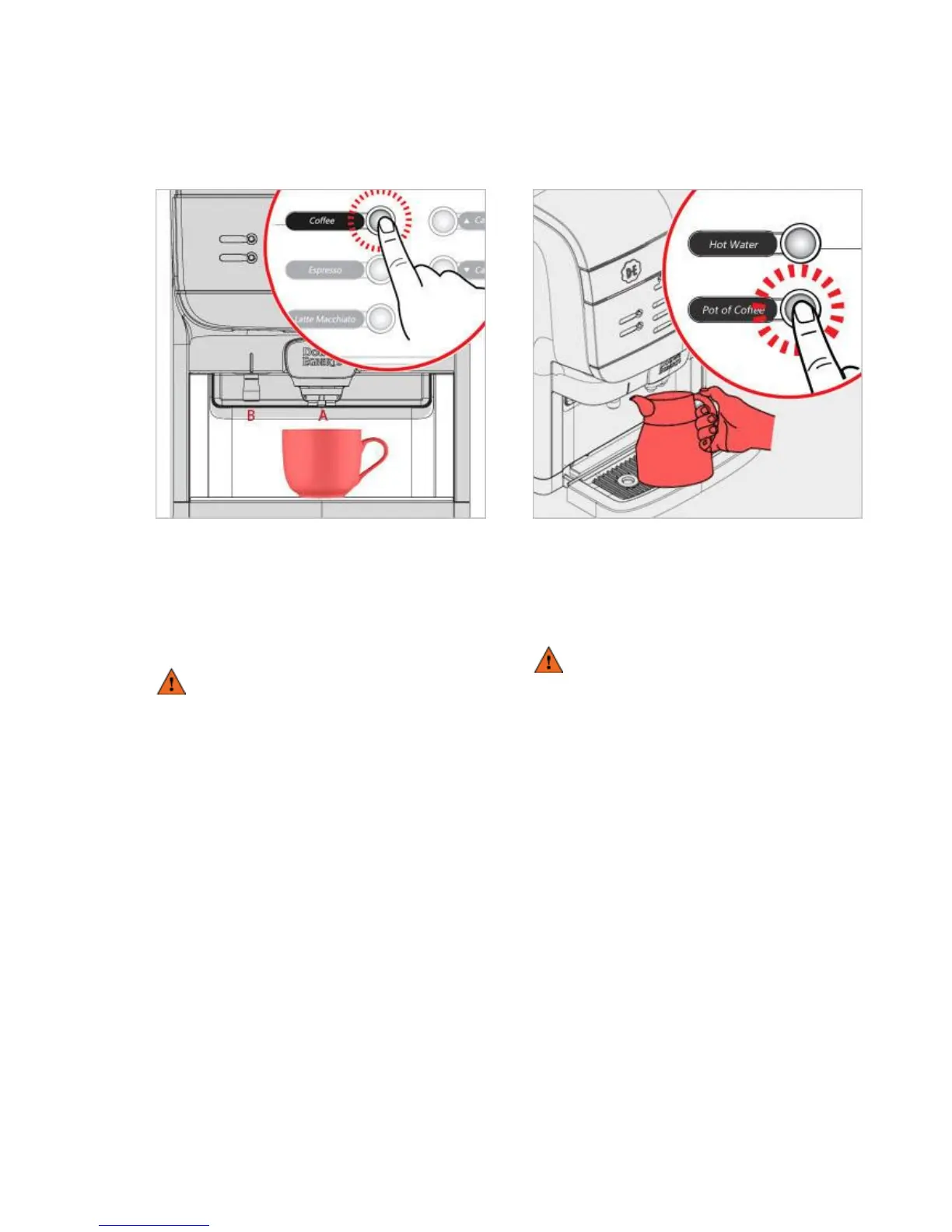 for coffee (A) or left outlet for hot water (B).