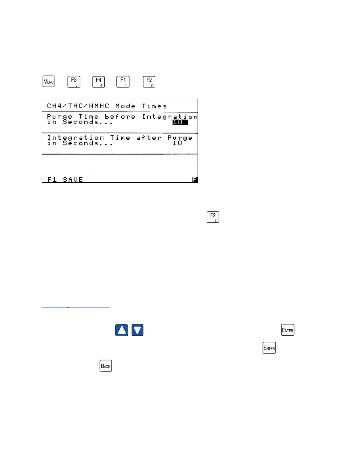 /NMHC Mode Times screen allows the operator to set the Purge Time and