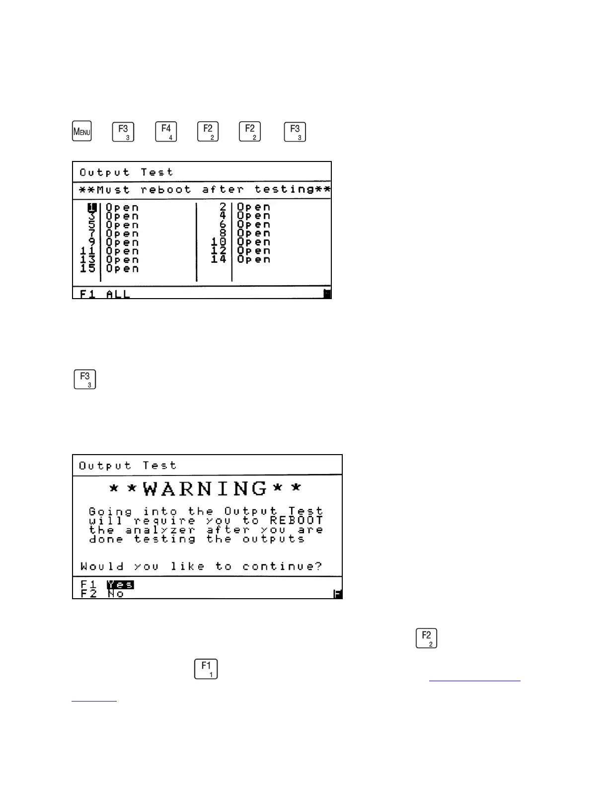 To exit the Output Test screen and proceed with normal operation press . To continue to the