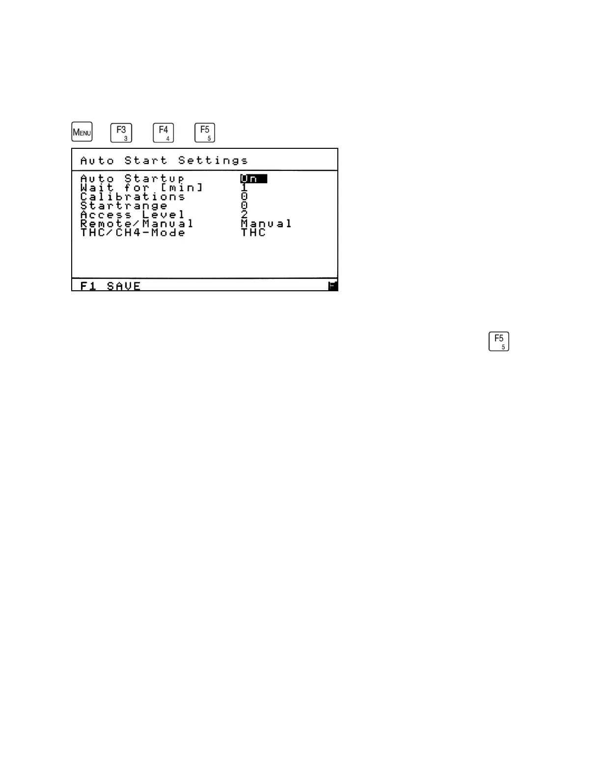 upon power up of the analyzer. The Auto Start Settings screen is accessed by pressing