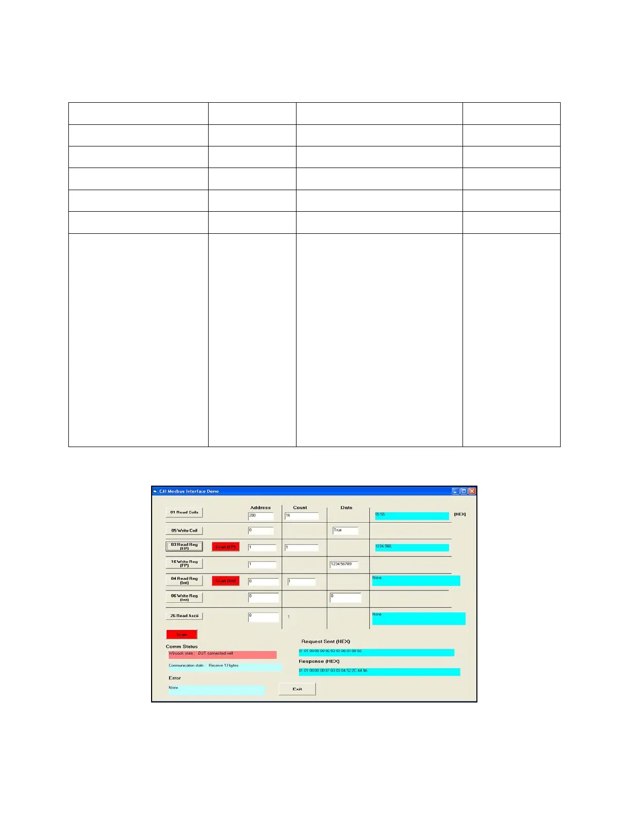 Command 03, Read Floating Point Value from Address 1. Result = 1234.56789.