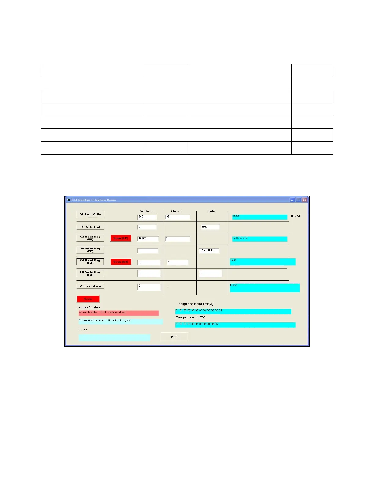 Command 04, Read one integer value from Address 0. Result = 1234.