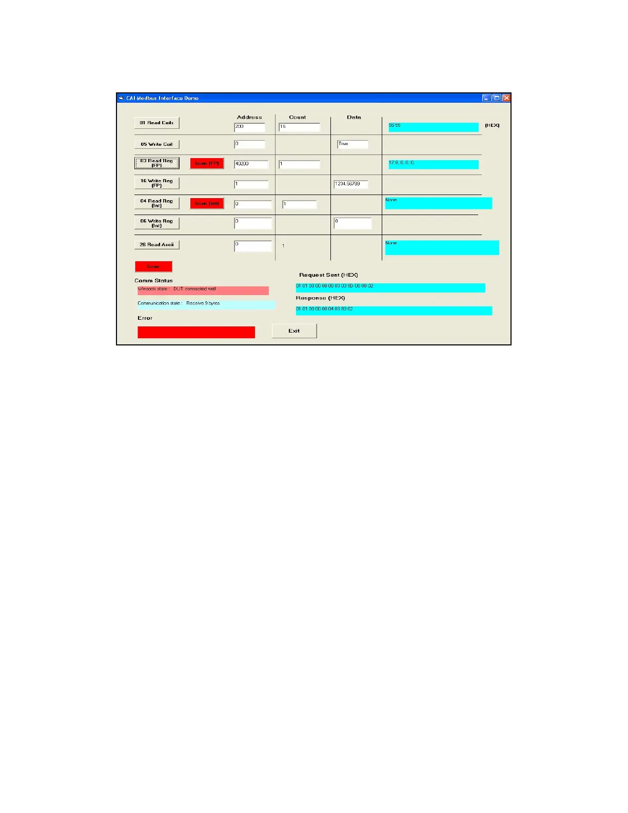 Command 16, Write one floating point register at Address 40200 showing error response.