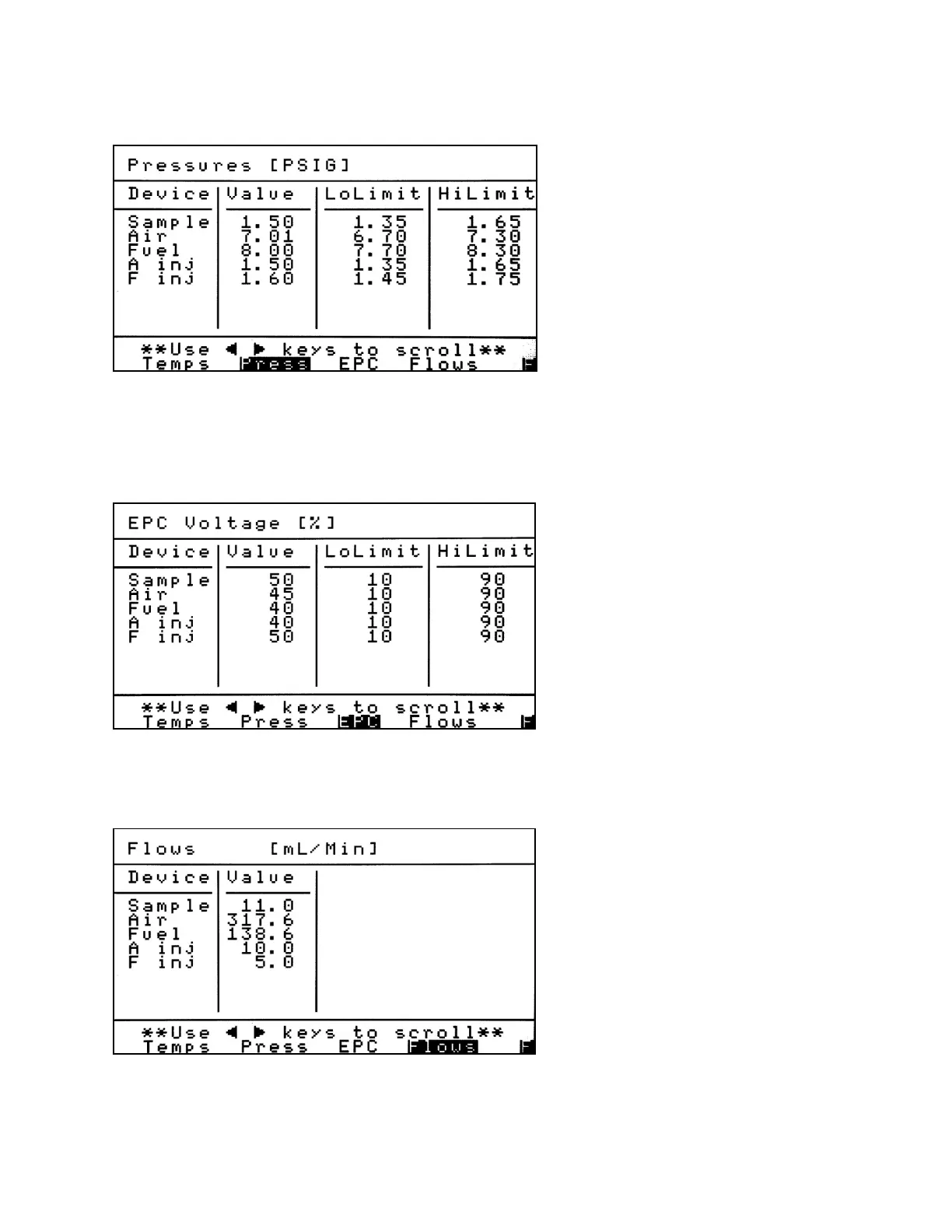 The Pressures screen displays current sample and air pressures and low and high alarm limits in