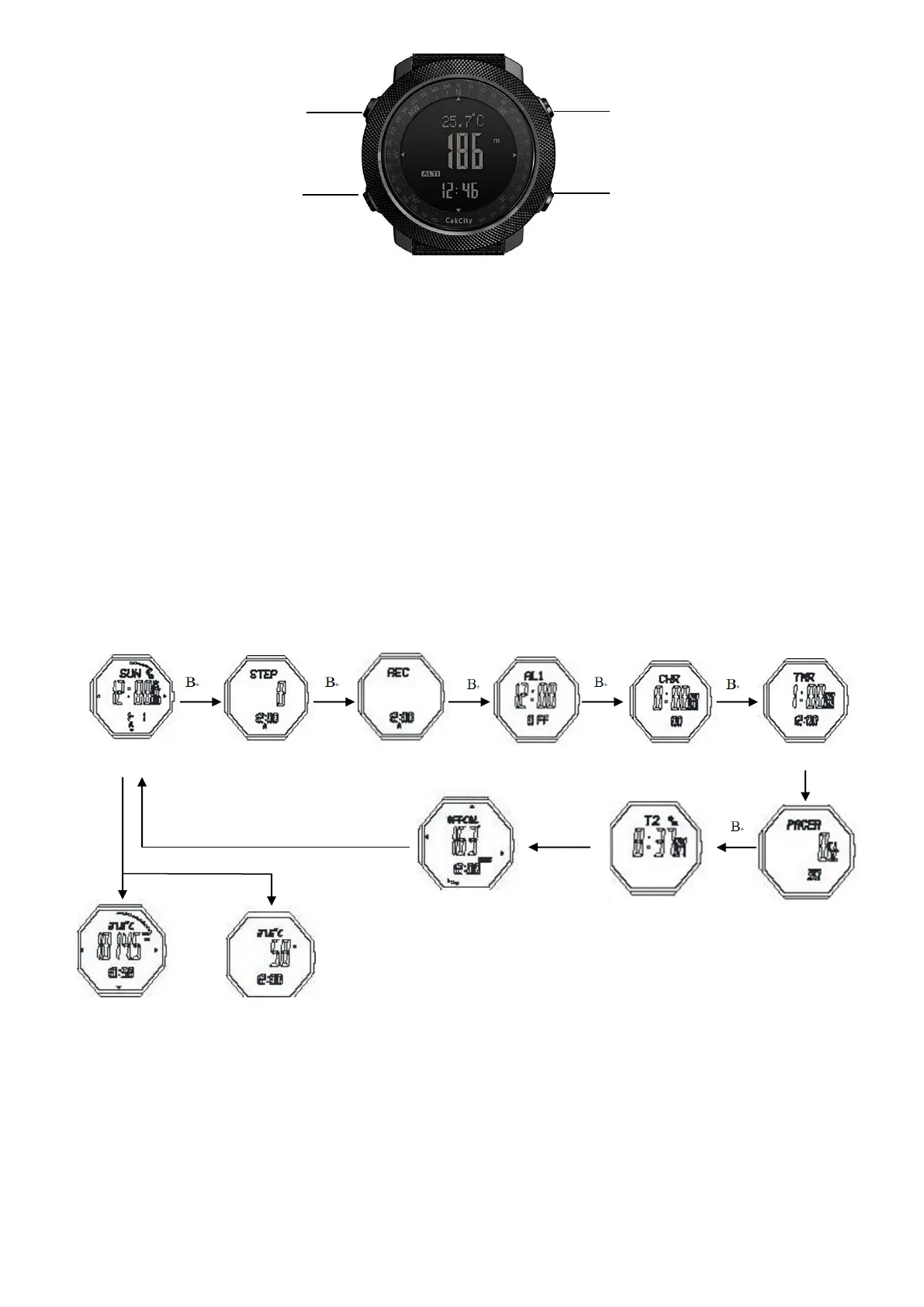➢ In timekeeping mode, keep pressing button D for 2s to shift: week—temperature—altitude