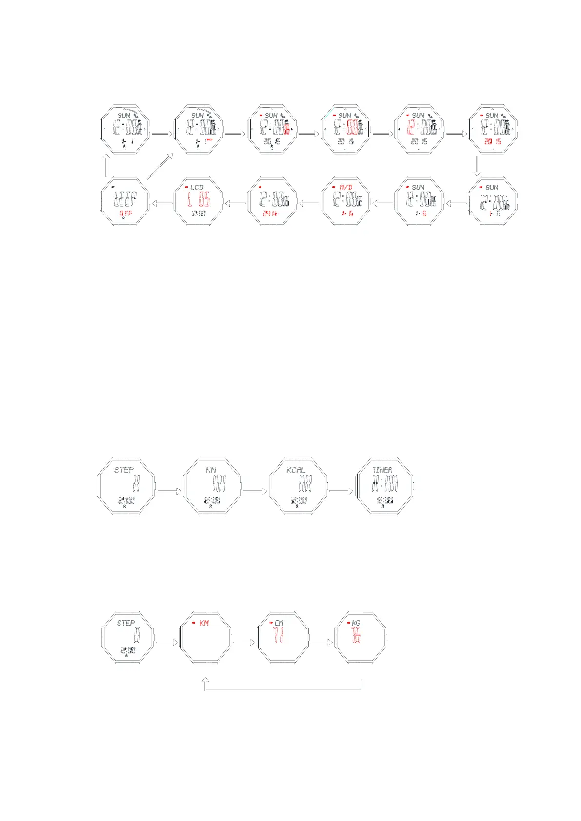 ➢ In pedometer mode, keep pressing button B for 2s,the unit flashes, entering setting mode