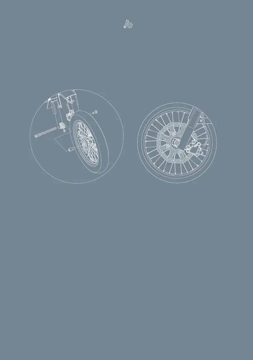 7. Mount the wheel. Tighten the wheel axle screw. Use Allen key 8mm and 10mm.