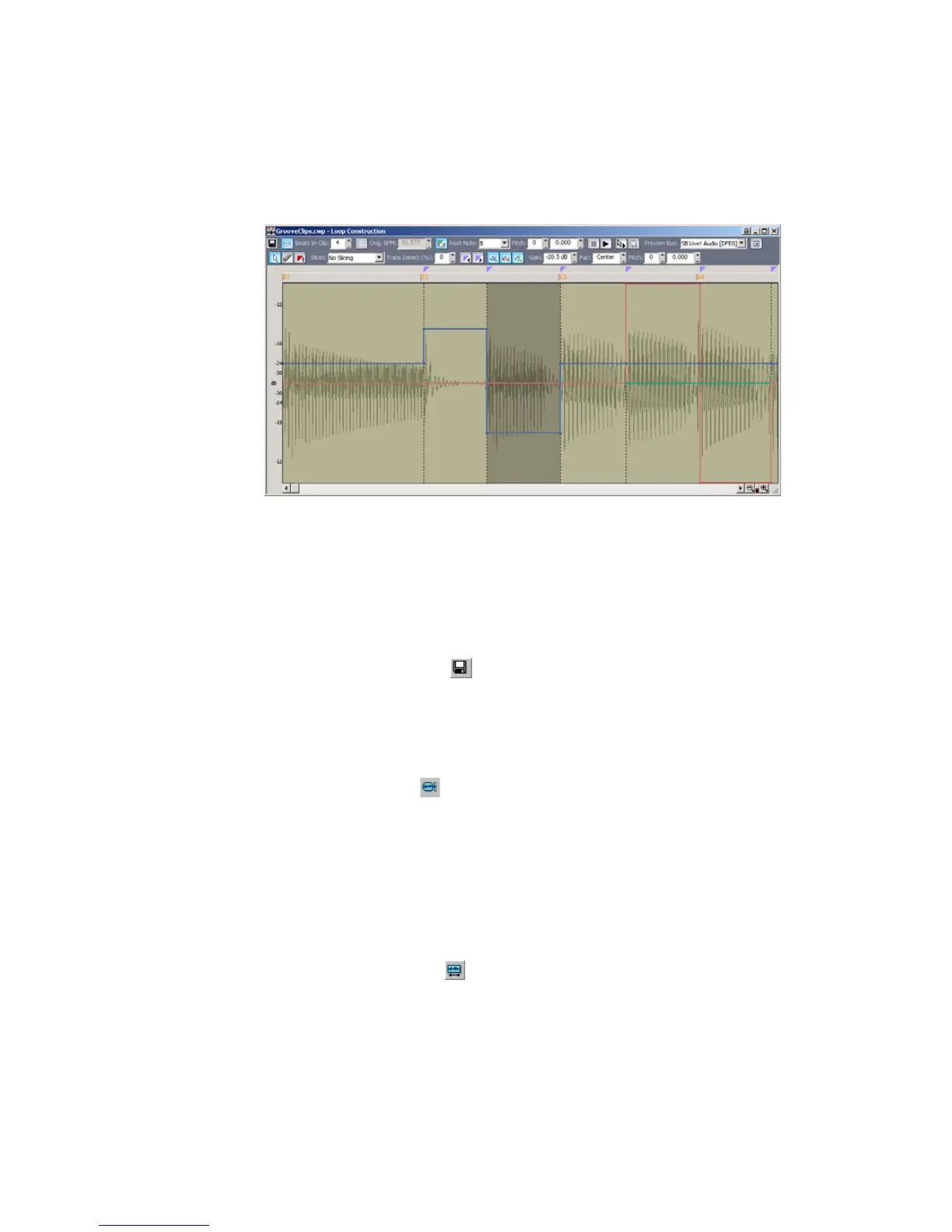 This button opens the Save As dialog. The clip in the Loop Construction view is