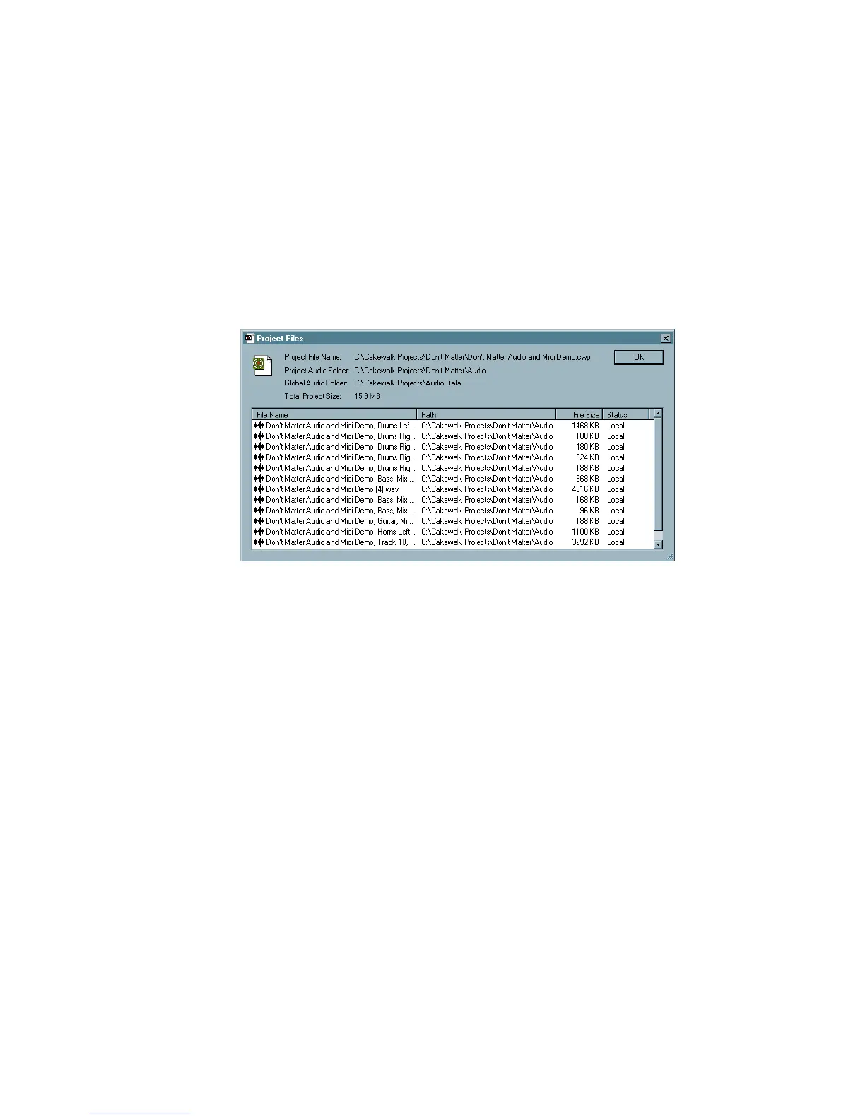 The Project Files dialog lists all of your project’s audio files and their location. This