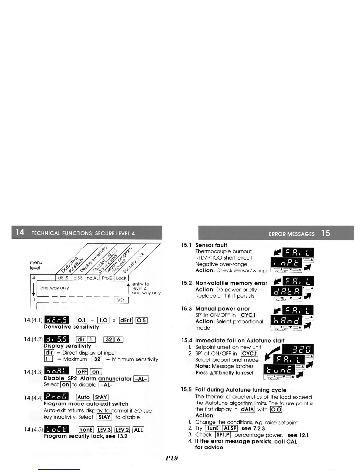CAL Controls CAL 3200 - Technical Functions: Secure Level 4; Error Message Diagnostics; Autotune Error Conditions; Derivative and Display Sensitivity Settings