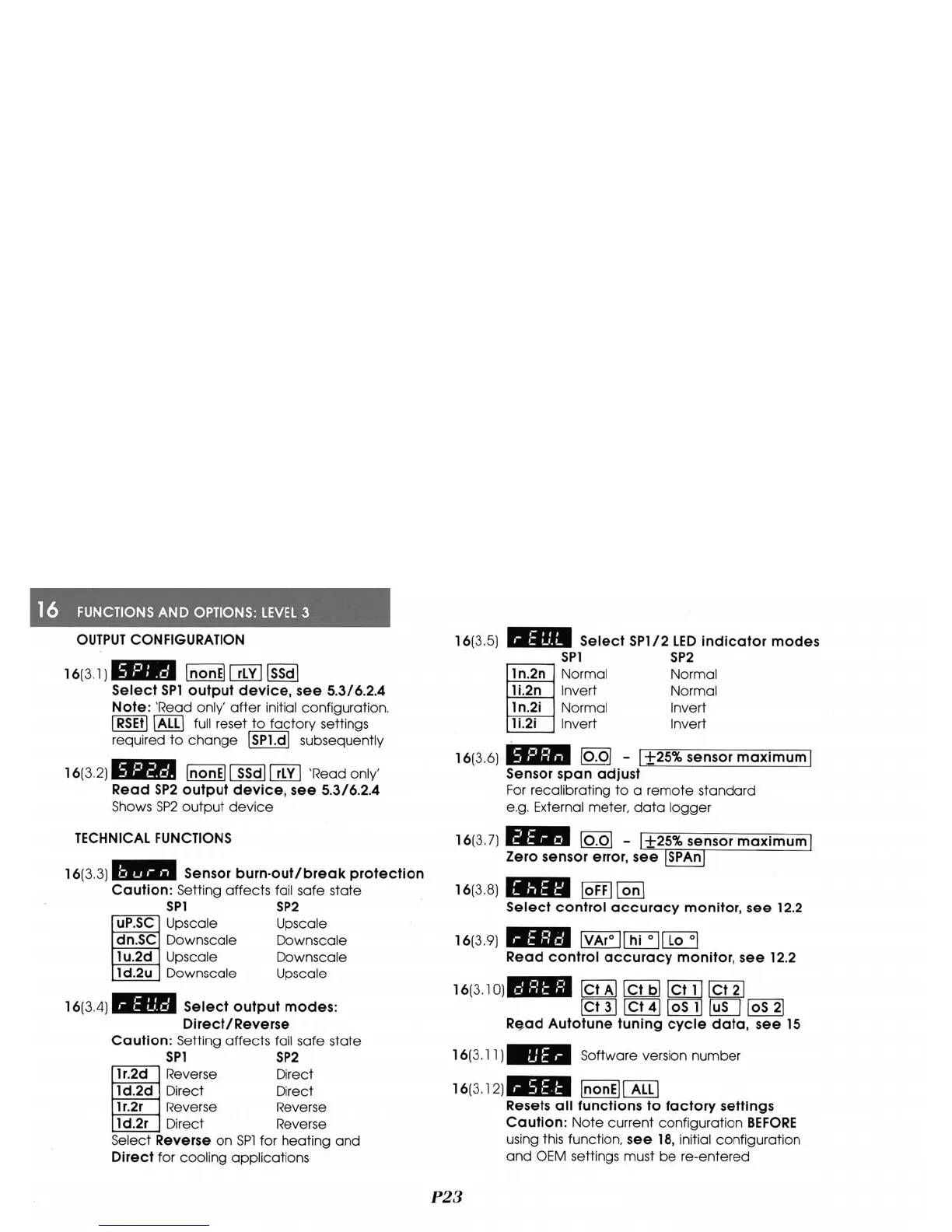 CAL Controls CAL 3200 - Functions and Options: Level 3; Output Configuration and Modes; SP1;2 LED Indicators and Span Adjust; Control Accuracy and Autotune Data