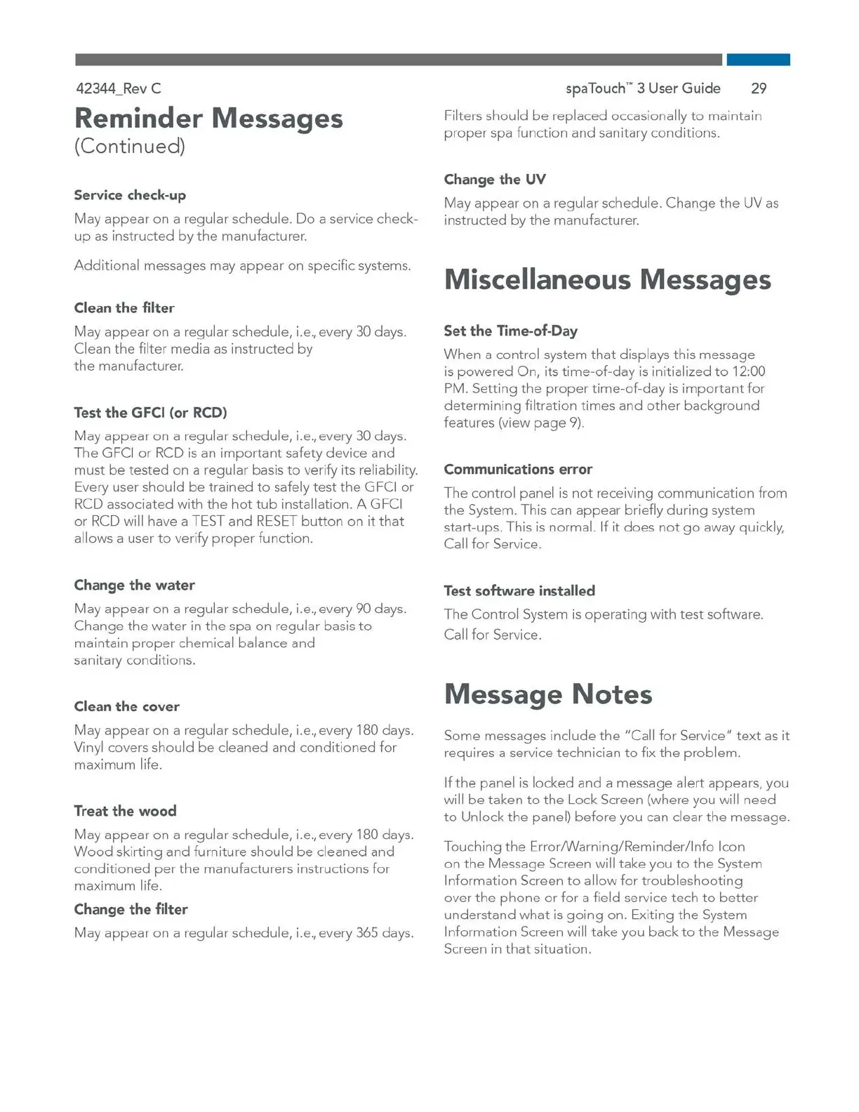 Cal Spas ESCAPE - Reminder and Miscellaneous Messages
