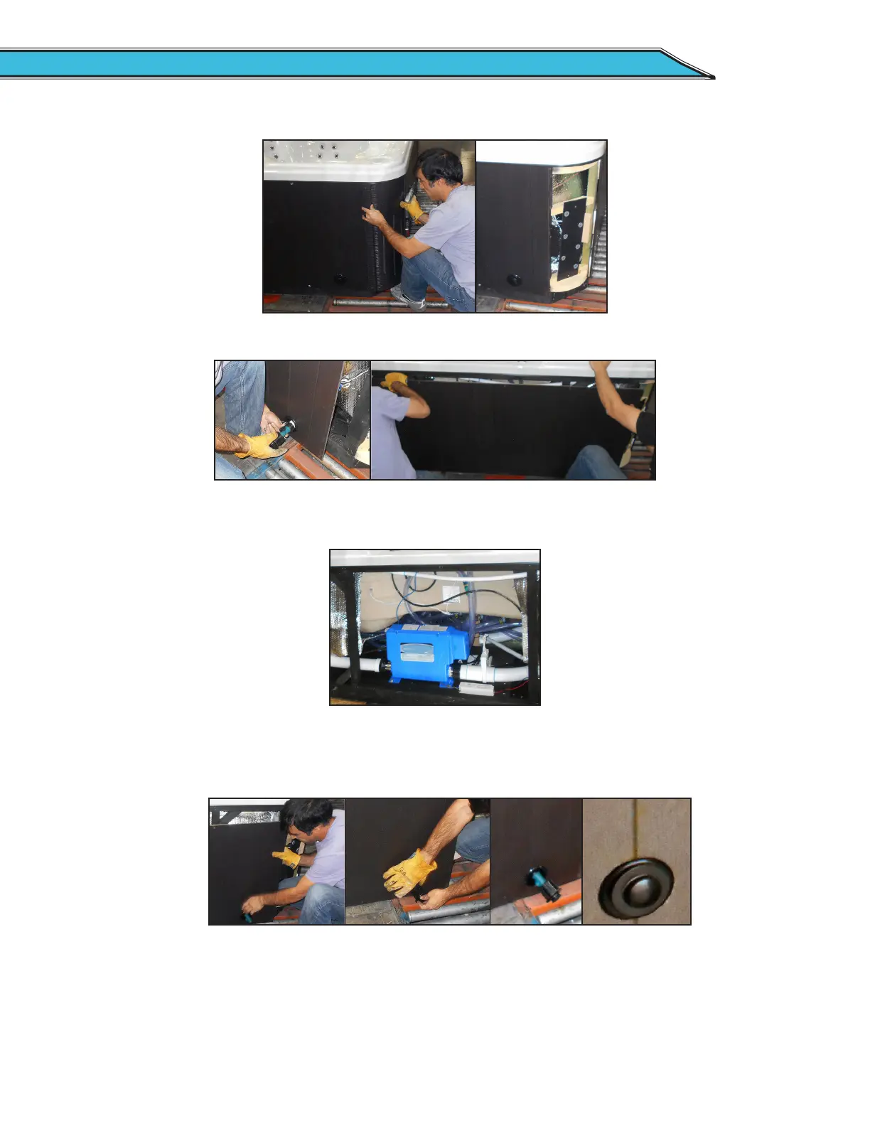 Unscrew and remove the two corner panels on each side of the spa’s front door.