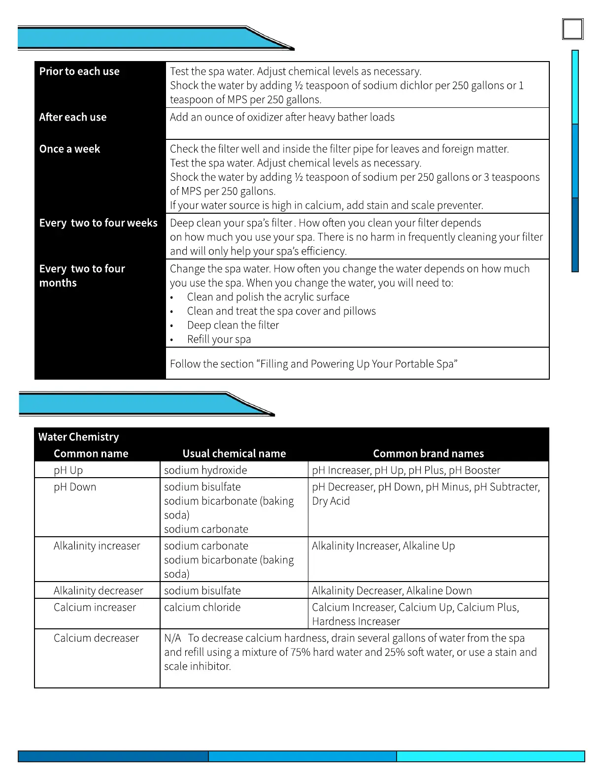 Cal Spas PATIO PLUS - General Water Care Schedule; Generic Names for Chemicals