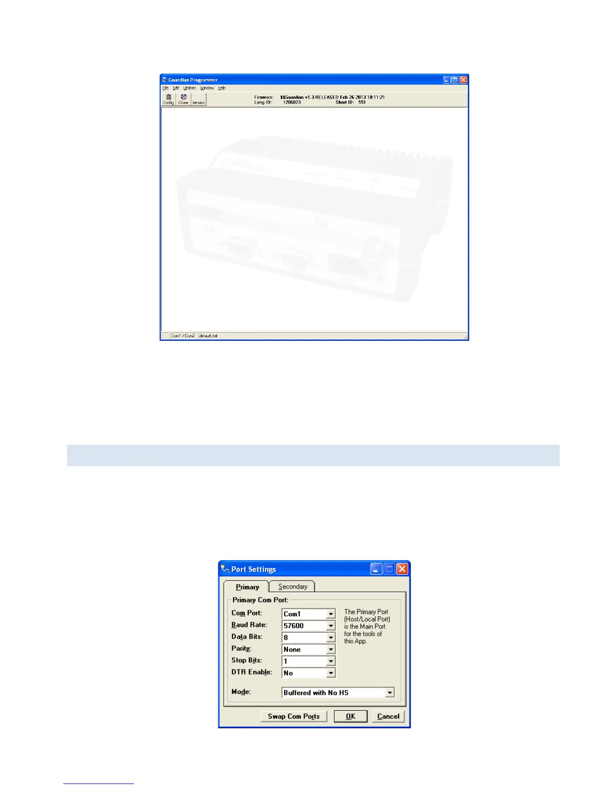 Guardian programming is through the PC’s Primary COM Port. Primary and secondary COM ports are configured with