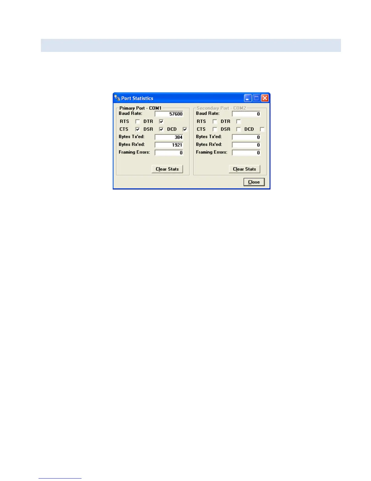 Bytes Transmitted shows the number of bytes (characters) transmitted since the port was last opened or cleared.