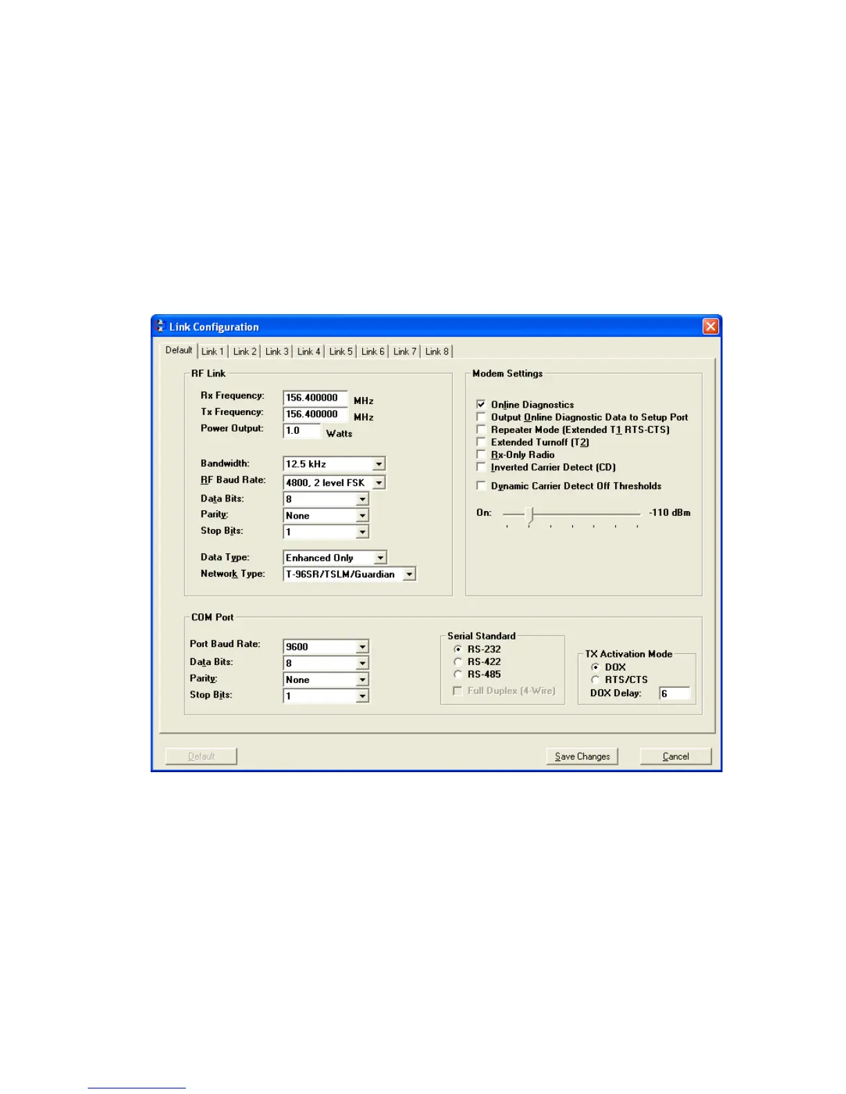 Link Configuration settings are modified from three sections on this window: Modem Settings, RF Link, and COM Port.