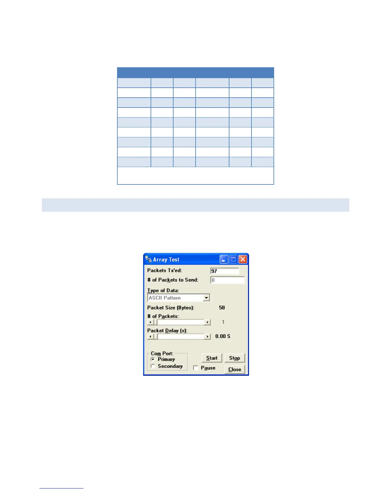 The Array Test window is accessed from the Utilities menu. The Array Test is used to send programmable length test