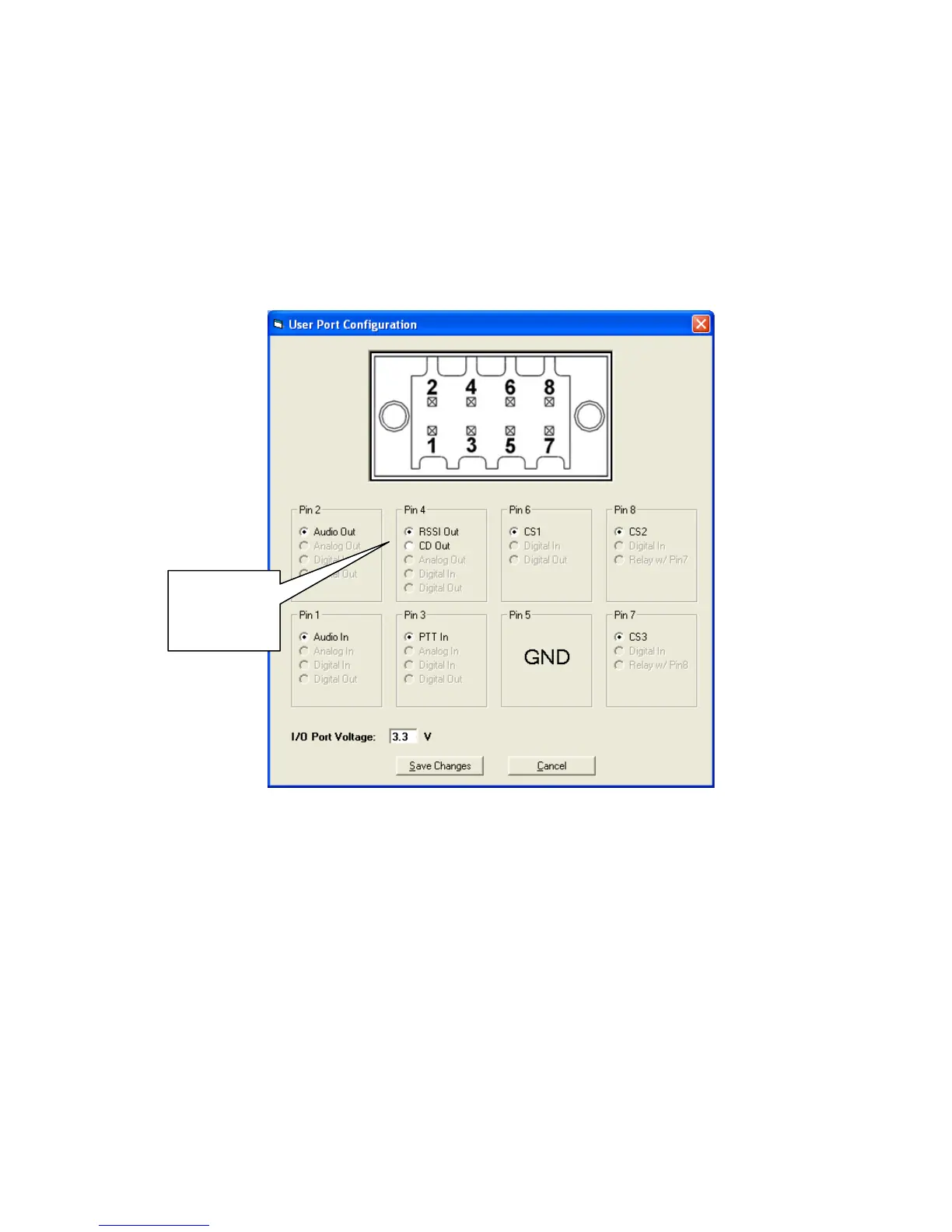 Click User Port Configuration in the User Configuration window to display the User Port pin-out configuration. (See the