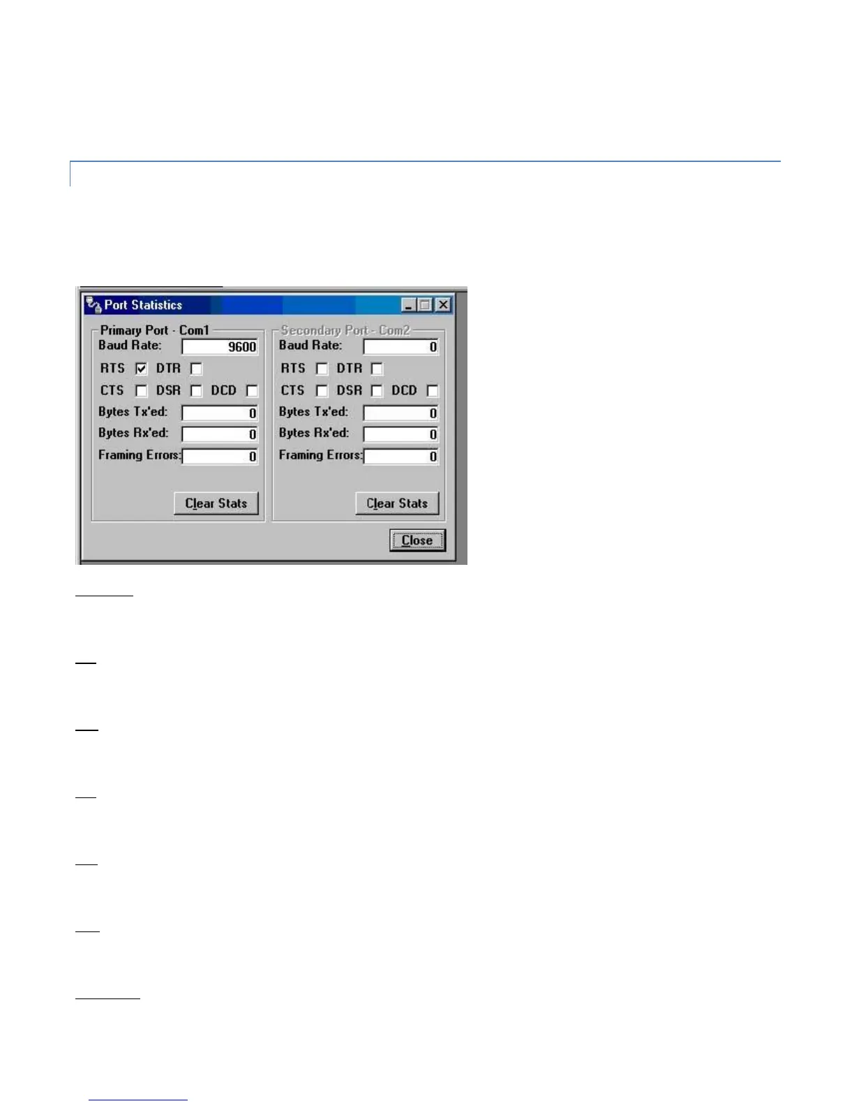 Port Statistics are accessed from the Utilities pull-down menu and show the current parameters of the PC’s Primary and