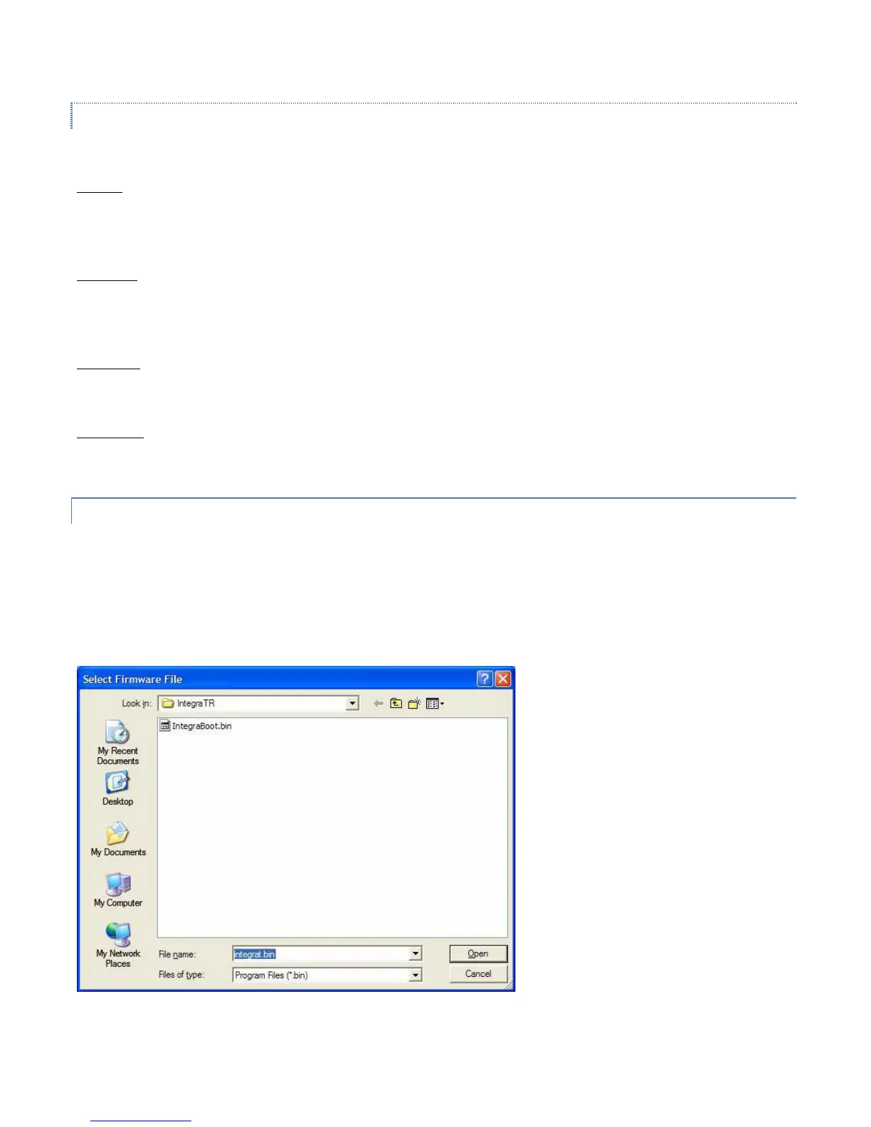 Integra-TR) or upgrade the Boot Code file. Selecting one of these options opens a standard navigation window to select the