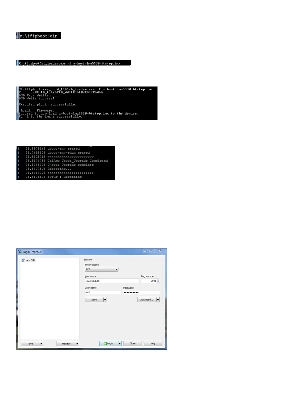 At the prompt c:\tftpboot, type: sb_loader.exe -f u-boot-lmu5541-btstrp.imx <enter>