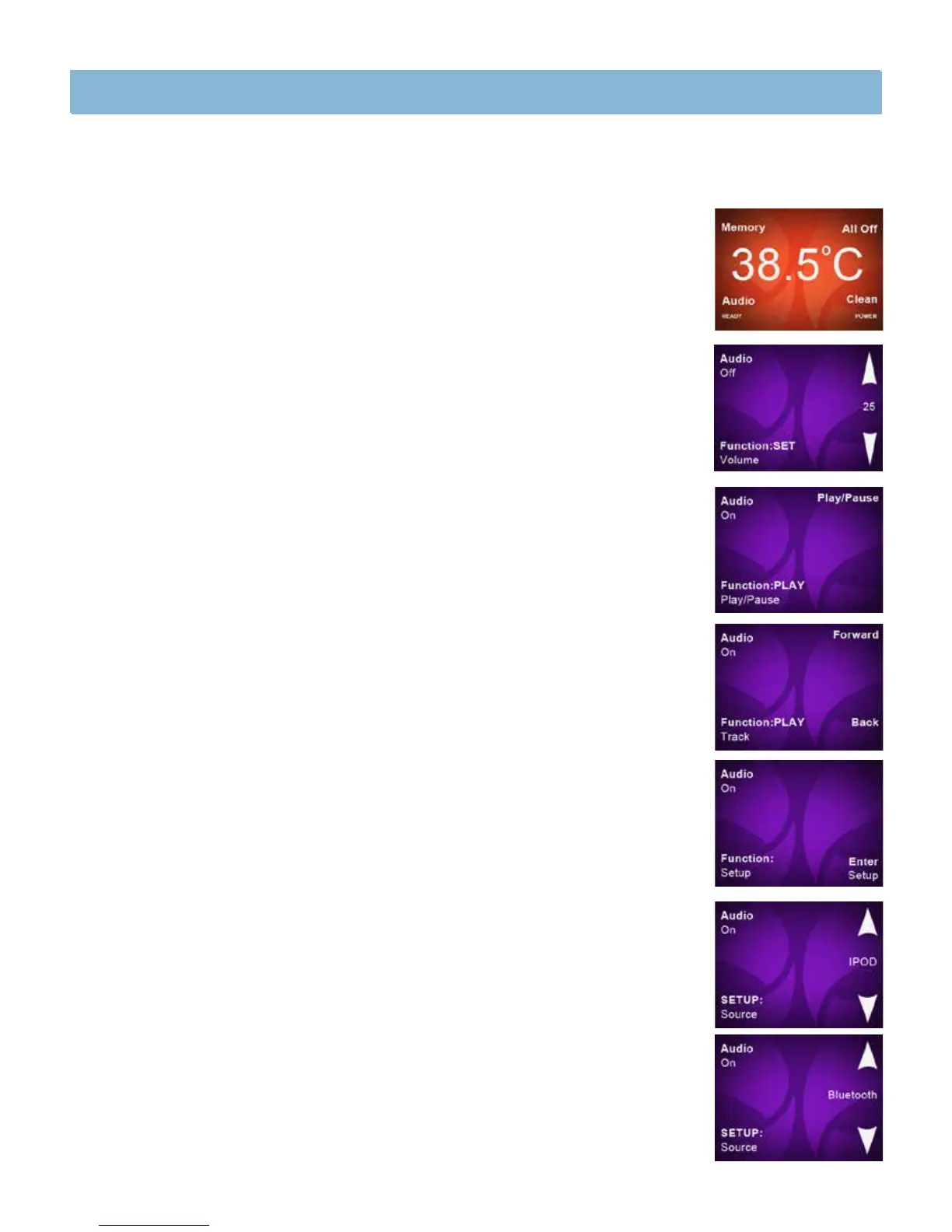 This Source screen illustrates the current audio source the spa is using, when using a wireless dock the IPod