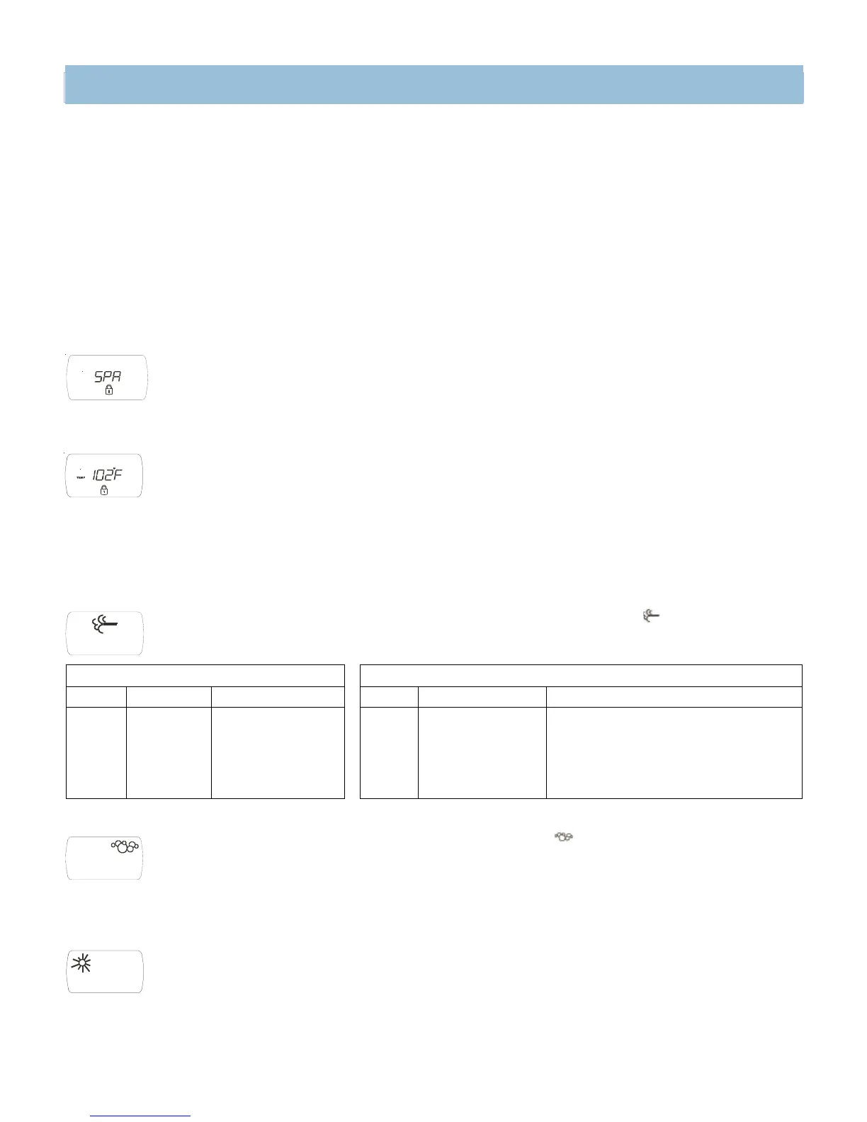 TodeactivatetheSpaLock,press“SET”button+“TEMP▼”buttonandholdforthreesecondsuntiltheSPAandlocksymbolarenolonger