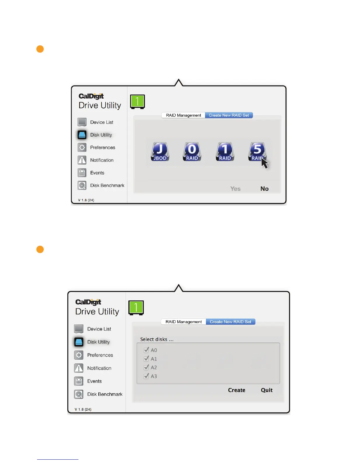 4 Go back into the “Disk Utility tab and select Create New RAID Set. Then Select RAID 5.