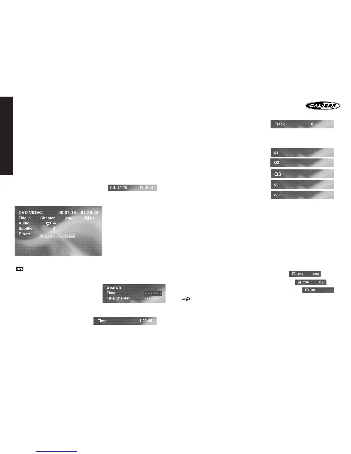 CD), and total number of chapters or tracks.Also displayed (for DVD only) is the current title, total number of titles,
