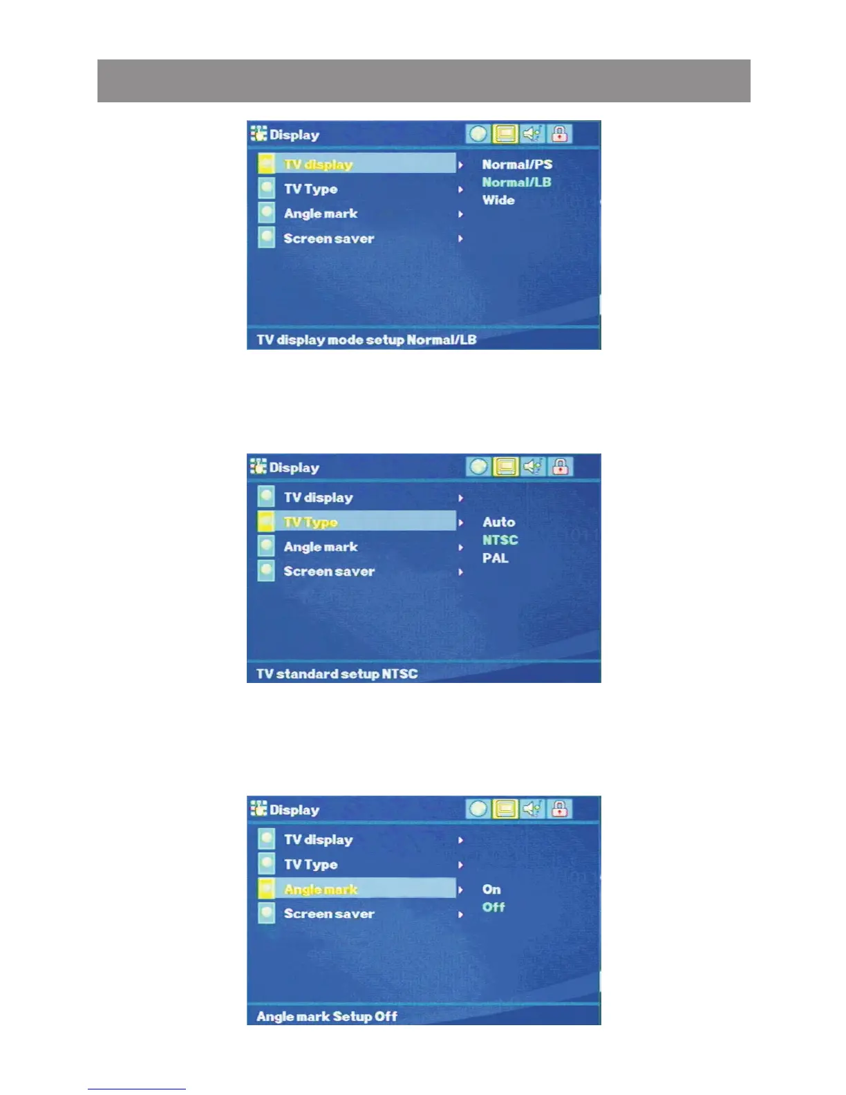 The Display setting allows the user to select the TV type. The