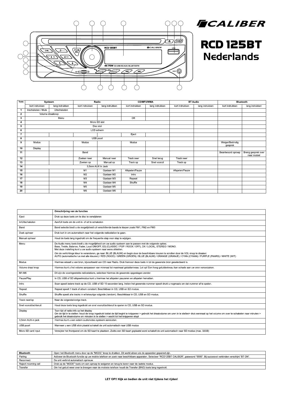 Pairing Activeer de Bluetooth functie op uw mobile telefoon en zoek naar beschikbare apparaten. Selecteer “RCD125BT CALIBER”, paswoord “0000”. Bij succesvol verbinden verschijnt “BT ON”.