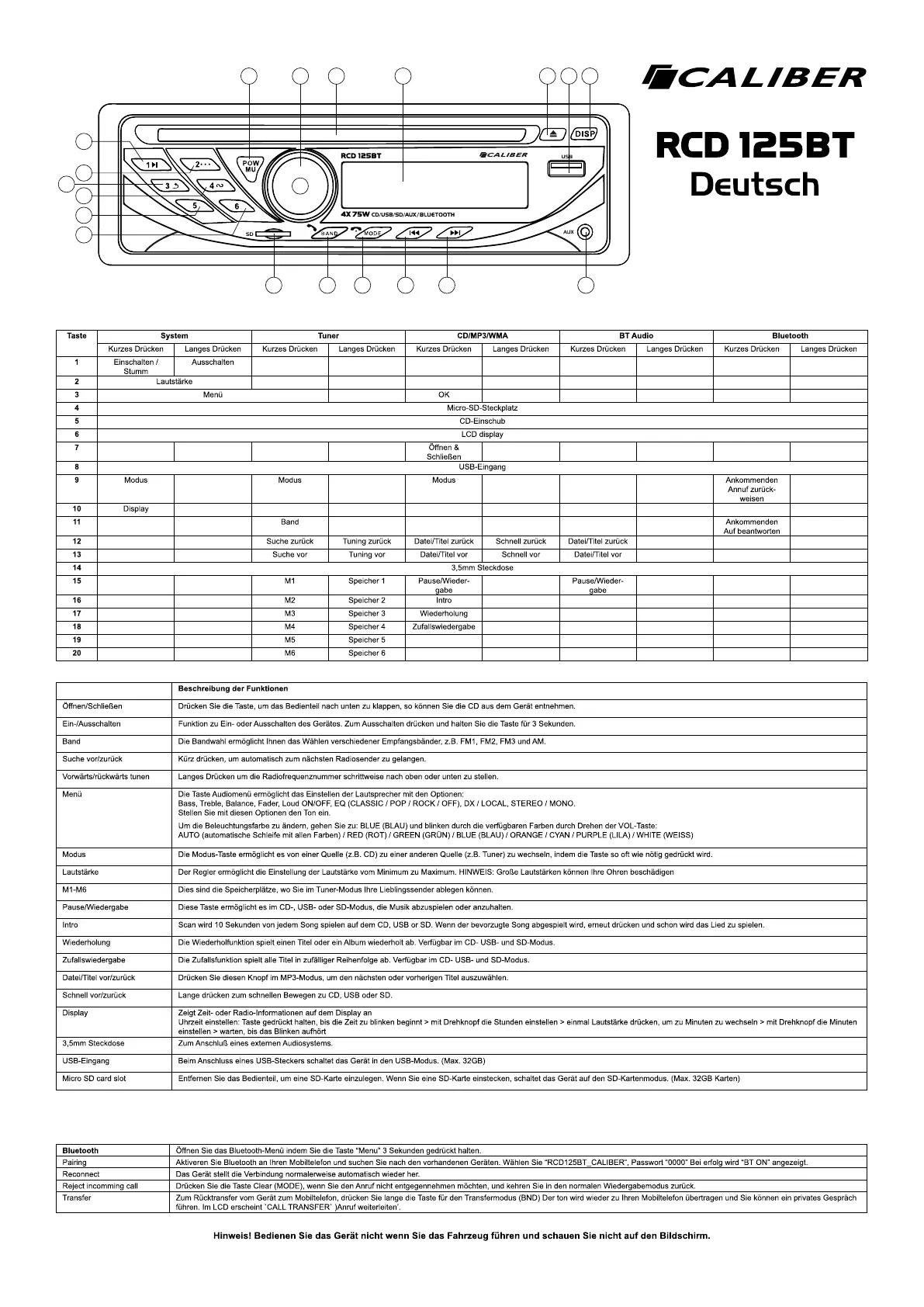 Pairing Aktiveren Sie Bluetooth an Ihren Mobiltelefon und suchen Sie nach den vorhandenen Geräten. Wählen Sie “RCD125BT_CALIBER”, Passwort “0000” Bei erfolg wird “BT ON” angezeigt.
