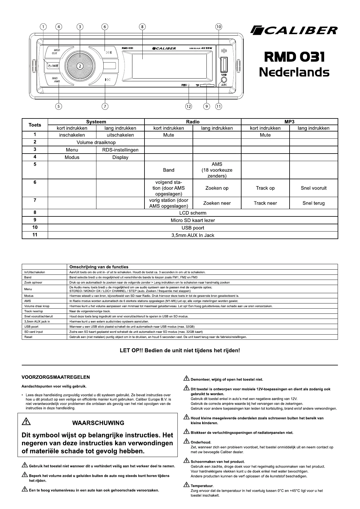 SD card input Zodra een SD kaart geplaatst word schakelt de unit automatisch naar SD modus (max. 32GB kaart)