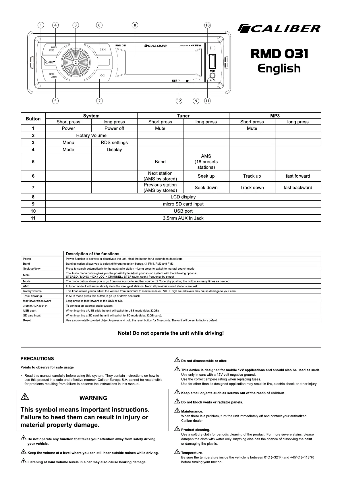 SD card input When inserting a SD card the unit will switch to SD mode (Max 32GB card).