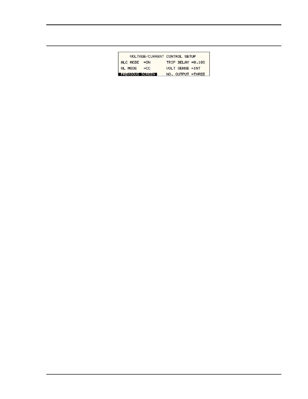 The VOLTAGE/CURRENT CONTROL SETUP menu may be used to set output voltage and current