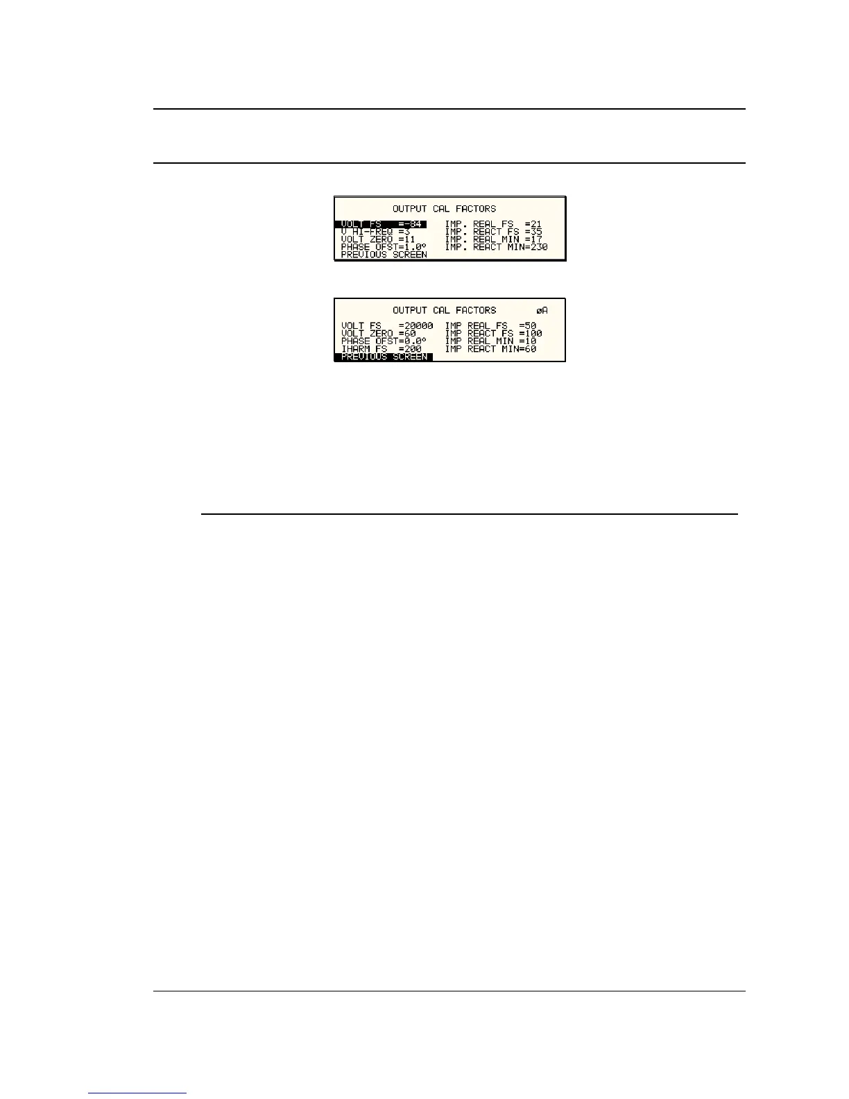 The OUTPUT CAL FACTORS menu provides access to the output calibration parameters.