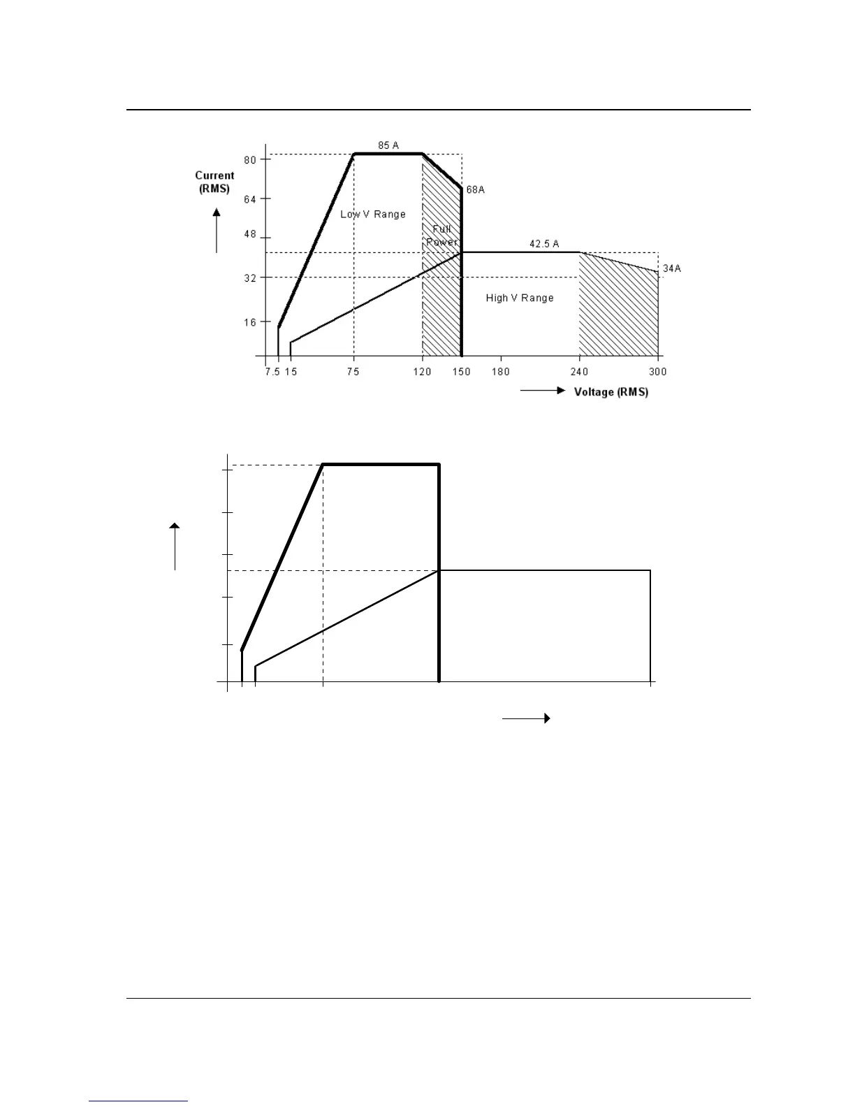 California Instruments MX Series - Figure 2-1: MX30-3 Voltage; Current Rating Chart for 150;300 V AC Ranges; Figure 2-2: MX45-3 Voltage; Current Rating Chart for 150;300 V AC Ranges - Max Rating