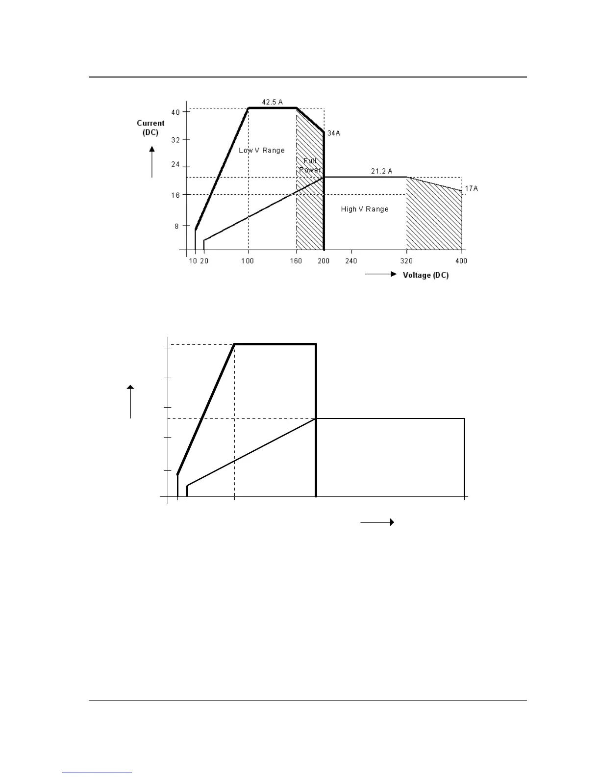 California Instruments MX Series - Figure 2-4: MX30-3 Voltage; Current Rating Chart for 200;400 V DC Ranges; Figure 2-5: MX45-3 Voltage; Current Rating Chart for 200;400 V DC Ranges - Max. Rating