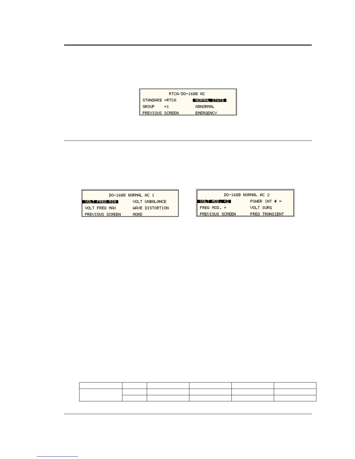 The DO160 NORMAL 1 and NORMAL 2 screens have the following tests: