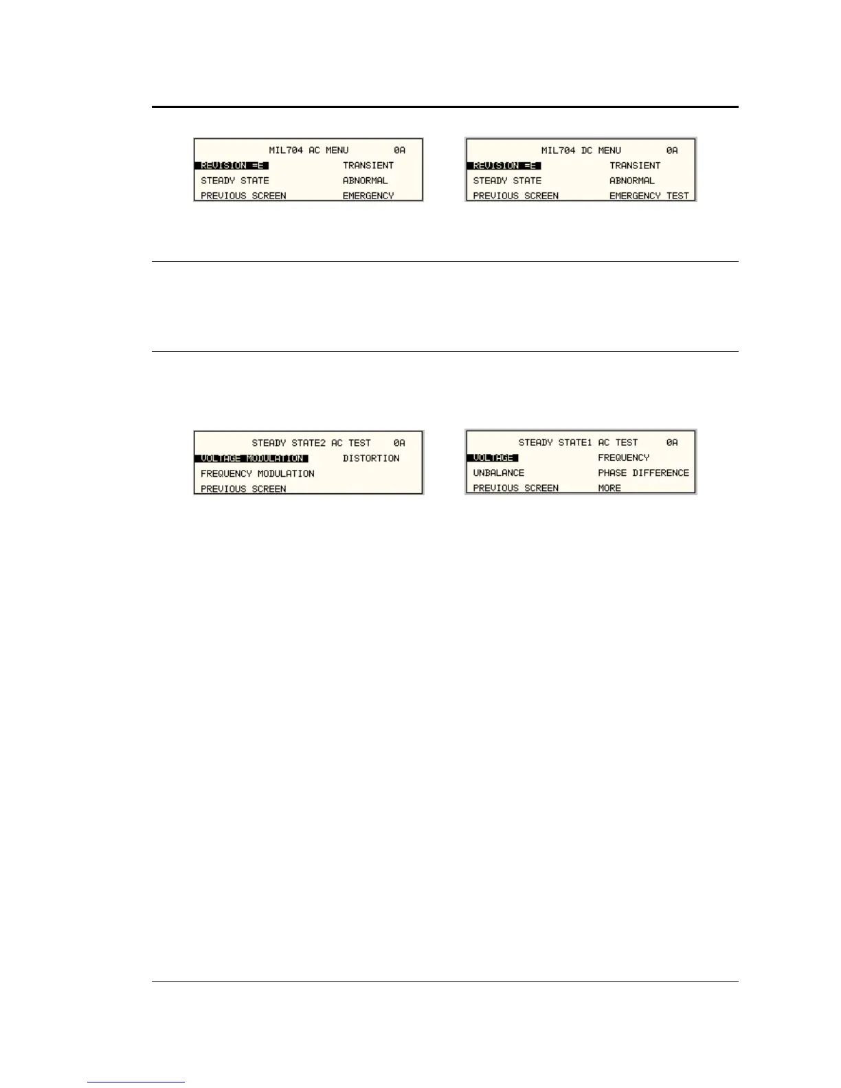 The MIL704 Steady state 1 and Steady state 2 screens have the following tests:
