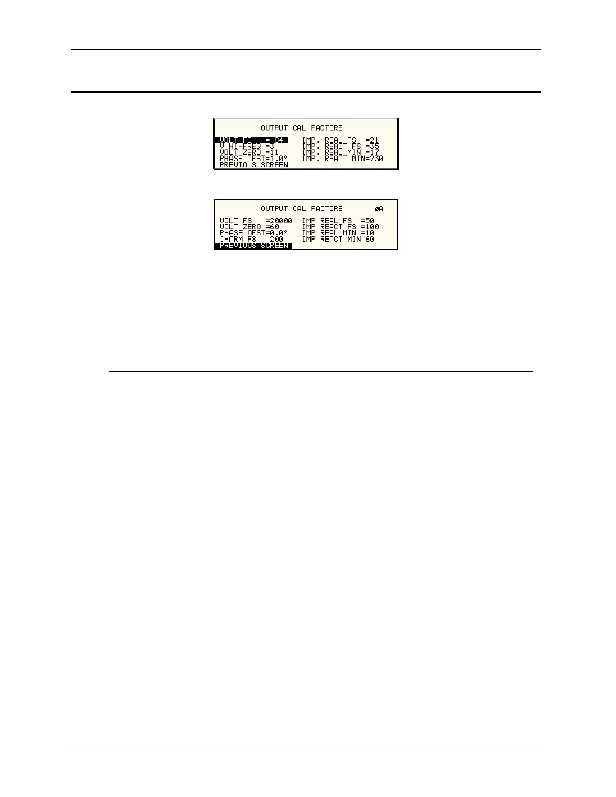 The OUTPUT CAL FACTORS menu provides access to the output calibration parameters.