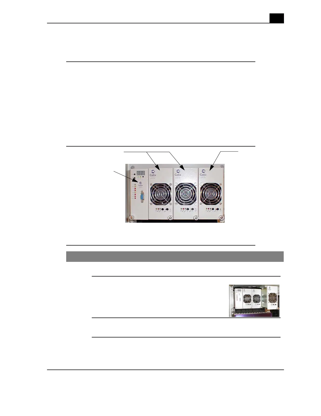 The Calix rectifier shelf contains an alarm control unit on the left and space for three