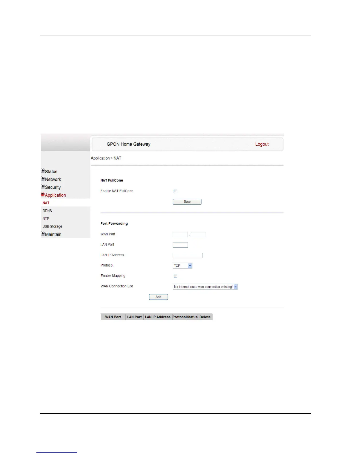 In Application page, there are 4 options, including NAT, DDNS, NTP, and USB Storage.
