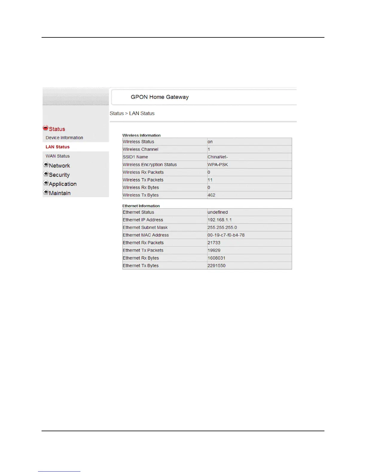 In the LAN Status page, you can view the information of Wireless Interface and Ethernet