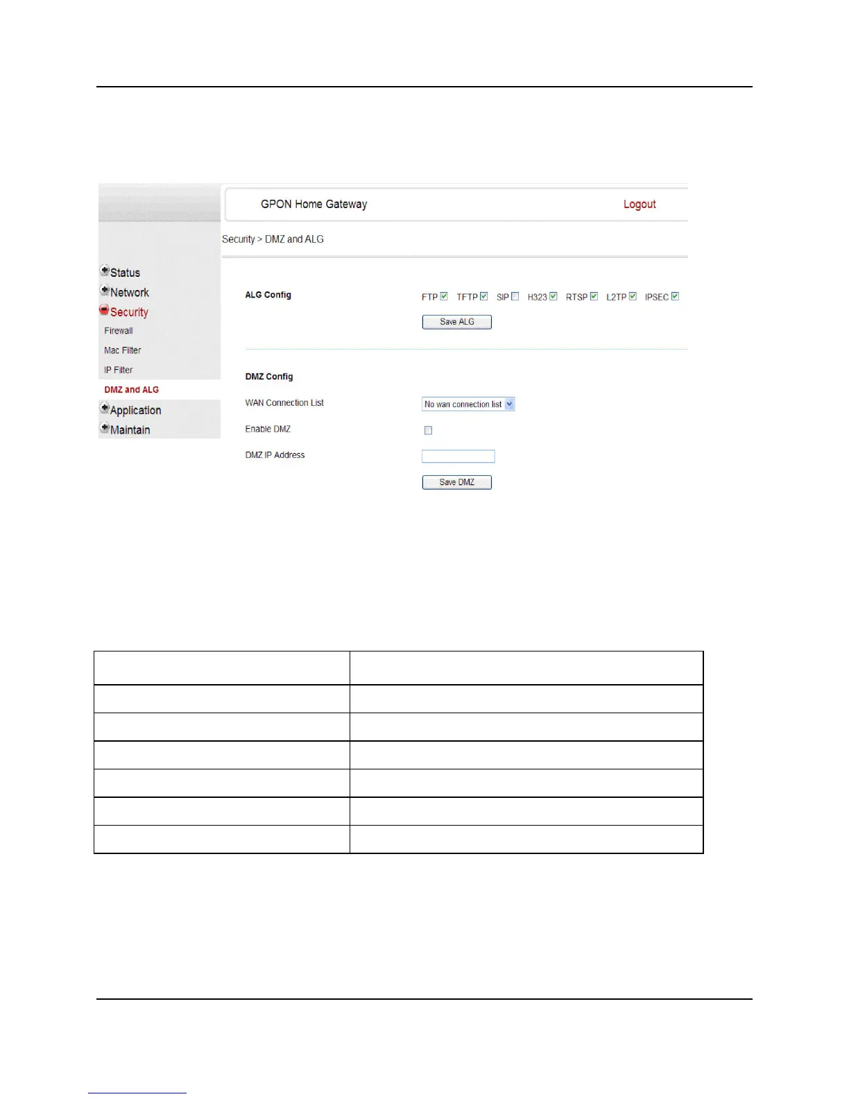 In DMZ and ALG page, you can do advance NAT configuration like ALG and DMZ.