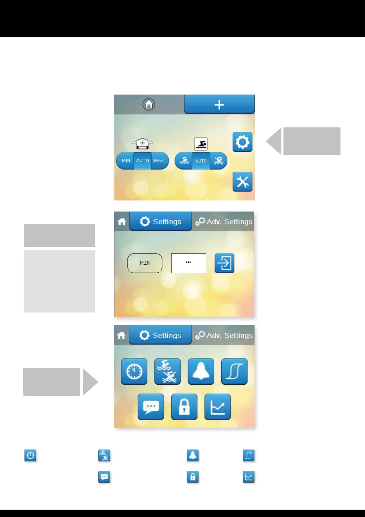 The main User Settings screens are protected by a PIN code. User Settings can be accessed by pressing e cog button on e second Home screen.